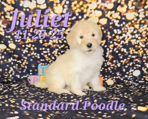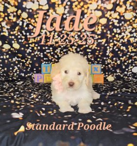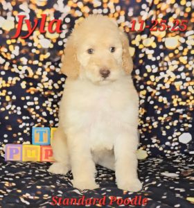 Jyla features a stunning apricot and cream coat and a sweet, affectionate personality. She is playful yet gentle, showcasing the balanced temperament Standard Poodles are loved for.